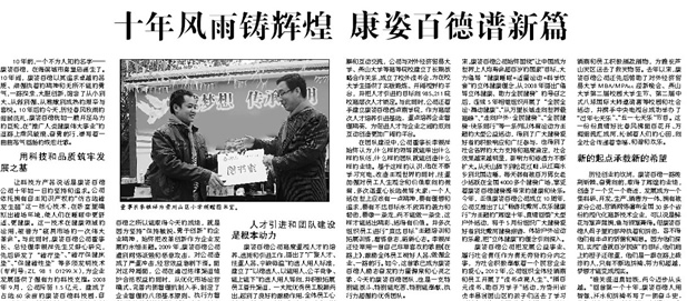 報道從公司的科研成果、改革創新精神、人才引進和團隊建設、主題活動、未來憧憬等方面,反映瞭(le)公司成立10年來所取得的一系列驕人業績和公司發展過程中形成並(bìng)堅持的品質精神、價值理念、管理運營模式。這是該報爲公司10周年華誕送上的一份大禮,必将激勵全體康姿百德人在新的起點上振奮精神、開拓進取,取得新的更大的業績。