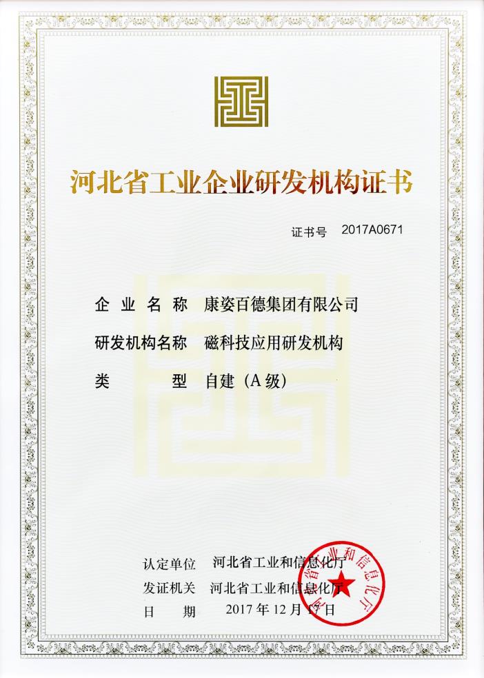 日前,經河北省工業和信息化廳審定,康姿百德集團入選河北省工業企業研發(fā)機構名單(dān),被認定爲磁科技應用研發(fā)機構(gòu)(A級)。