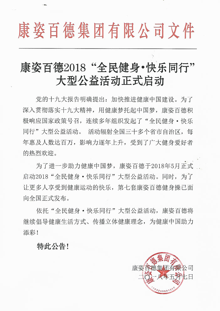 康姿百德2018“全民健身•快樂(lè)同行”大型公益活動(dòng)正式啓動(dòng),公告全文如下: