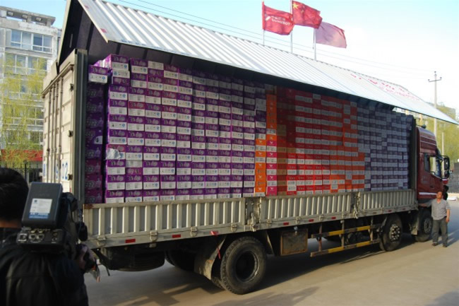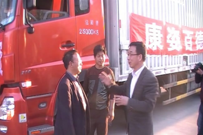25日上午9點,物資車到達石家莊。石家莊康姿百德總代理李志華,代表新華區、裕華區、橋西區、橋東區、長安區、開發區、辛集市、平山縣、藁城縣、正定縣等地的代理商将愛心物資裝上貨車