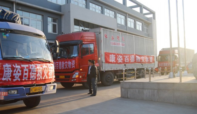 滿救災物資的貨車離開康姿百德公司,駛向災區 “捎去我的愛心,帶上我的祝福” “回饋社會,造福人類”,始終是康姿百德公司秉承的經營理念。全國各地的康姿百德經銷商在把幸福和健康帶給人們的同時,也深知自己身上的責任,不忘奉獻自己的愛心。他們積極捐款捐物,向災區人民伸出援助之手。物資車途經北京、河北、山西、河南等地時,當地經銷商囑咐司機一定把這份愛心物資安全送到災區, “捎去我的愛心,帶上我的祝福”,這是康姿百德人最強烈的心聲。
