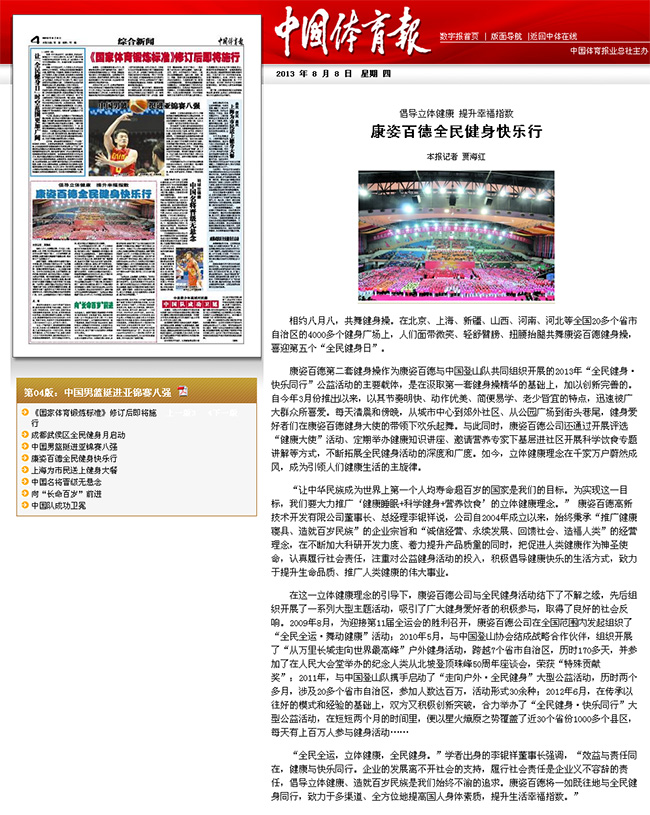 2013年8月8日,在第五個“全民健身日”到來之際,《中國體育報》以《倡導立體健康,提升幸福指數——康姿百德全民健身快樂行》爲題,對康姿百德公司“全民健身·快樂同行”大型公益活動進行瞭專題報道。這是繼去年8月8日、今年3月9日之後,《中國體育報》第三次對康姿百德公司全民健身活動進行的專題報道。 報道客觀準確地闡述瞭公司董事長李銀祥先生倡導提出的“健康睡眠+科學健身+營養飲食”的立體健康理念,以及在這一理念的引導下,全國各地以康姿百德健身操爲載體,近年來開展“全民健身 快樂同行”等有關大型公益活動的曆程和取得的社會效益。同時,向廣大讀者和更多的人們深入宣傳瞭康姿百德公司把促進人類健康作爲神聖使命,認真履行社會責任、積極倡導健康快樂生活方式,緻力於提升生命品質、推廣人類健康偉大事業的崇高追求。報道對於鼓舞康姿百德人進一步堅定信心、腳踏實地做好各項工作,早日實現“讓中國成爲世界上第一個人均壽命超百歲的國家”的目标,具有積極的促進和激勵作用。