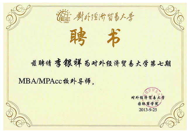 近日,我公司董事長、總經理李銀祥被對外經濟貿易大學聘任爲第七期MBA/MPAcc校外導師。9月25日在北京舉行的聘任儀式上,李銀祥和其他聘任導師一起宣誓,承諾将肩負教育事業的責任與使命,認真履行一名教育者的義務,無私奉獻、積極幫助那些懷揣激情的年輕人實現夢想。 據瞭解,“校外導師制度”是對外經濟貿易大學著眼培養高素質、複合型管理人才而推行的一項教育制度,主要聘請著名專家學者、知名企業家、政府官員等各界精英加盟,分享國内外最新研究成果、讨論企業管理熱點問題、交流先進的管理經驗,爲學生、學校、企業、政府打造信息交流的平台。 李銀祥董事長被聘任爲MBA/MPAcc校外導師,是學術界對我公司發展理念、管理水平的認可和肯定,對於公司進一步加強與高等院校的合作發展,培養引進高層次優秀人才都将起到十分積極的作用。