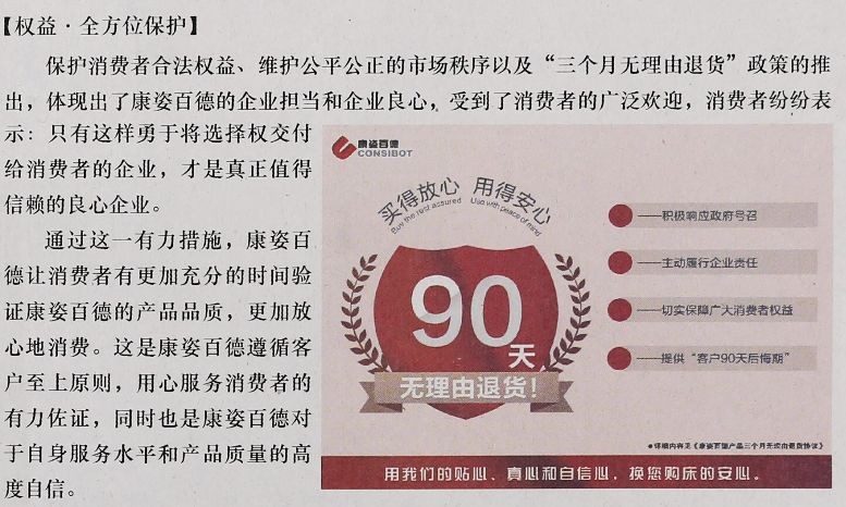 【權益·全方位保護】保護消費者合法權益、維護公平公正的市場秩序以及“三個月無理由退貨”政策的推出,體現出瞭(le)康姿百德的企業擔當和企業良心,受到瞭(le)消費者的廣泛歡迎,消費者紛紛表示:隻有這樣勇於(yú)将選擇權交付給消費者的企業,才是真正值得信賴的良心企業。
