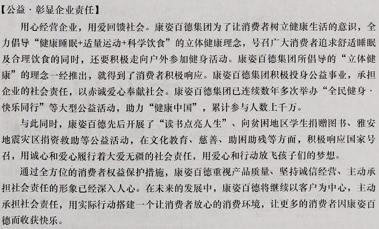【公益·彰顯企業責任】用心經營企業,用愛(ài)回饋社會。康姿百德集團爲瞭(le)讓消費者樹立健康生活的意識,全力倡導“健康睡眠+适量運動+科學飲食”的立體健康理念,号召廣大消費者追求舒适睡眠及合理飲食的同時,還要積極走向戶外參加健身活動。康姿百德集團所倡導的“立體健康”的理念一經推出,就得到瞭(le)消費者積極響應。康姿百德集團積極投身公益事業,承擔企業的社會責任,以赤誠愛(ài)心奉獻社會。