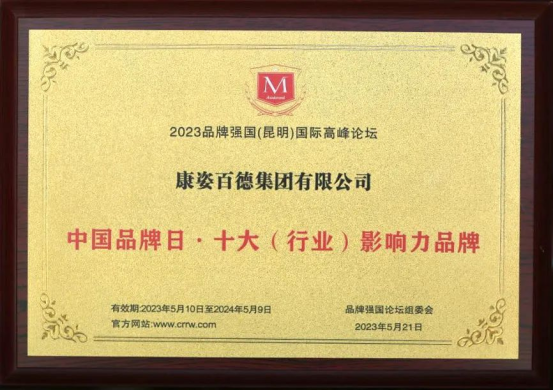 康姿百德集團榮獲“十大(行業)影響力品牌”稱号