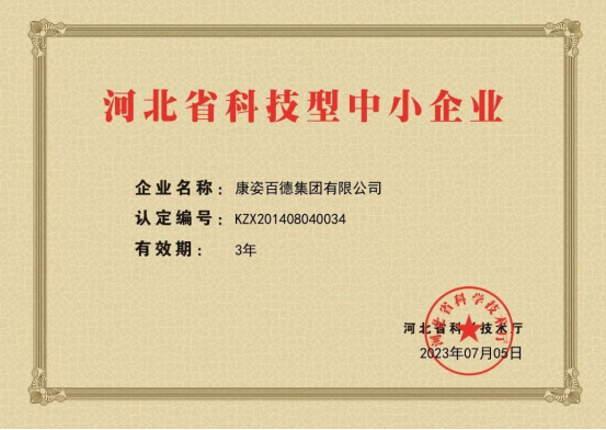 康姿百德集團憑借卓越的創新能力、研發能力和廣闊的市場前景,被河北省科學技術廳評定爲“河北省科技型中小企業”。目前已連續13年通過該獎項的評定。康姿百德榮獲“河北省科技型中小企業”稱号,不僅是對康姿百德在技術創新方面的肯定,更是對其在科技研發、成果轉化、企業經營管理等多方面取得的成績的認可。
