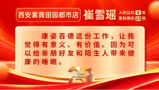 在加入康姿百德之前,崔雪瑤就瞭解過康姿百德産品,軟硬适中,不易變形,品質有保障。於是在入職第一個月就買瞭第1張床墊。随著(zhe)來公司的時間越來越久,崔雪瑤覺得産品質量是真的好,並(bìng)将産品推薦給親朋好友。如今,這些親朋好友已累計使用15張康姿百德床墊。在康姿百德工作這幾年,崔雪瑤也覺得這份工作有意義、有價值,因爲這份工作可以給親朋好友和陌生人帶來健康的睡眠。尤其是聽著(zhe)顧客向她講述康姿百德床墊睡著(zhe)非常舒服,並(bìng)且把這麽好的産品不斷推薦給身邊人,如今身邊使用康姿百德床墊的人越來越多。崔雪瑤聽後内心更是滿滿的自豪感!她表示,作爲一名康姿百德人,真的非常地驕傲和幸福!