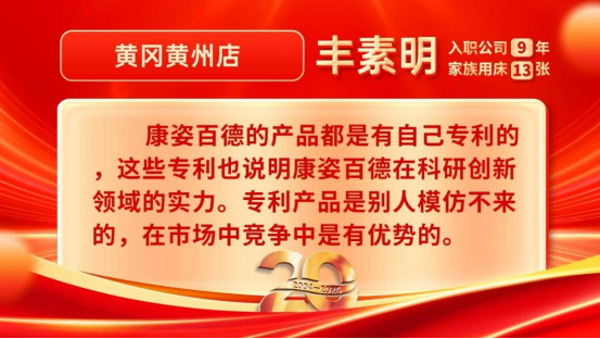 豐素明自己比較認可有科技含量的産品,所以入職第一年就買瞭(le)1張康姿百德床墊。每當有人因爲不瞭(le)解産品而持懷疑态度,豐素明總是自信的告訴客戶“我可以很負責的告訴大家,康姿百德産品都是有專利的,也是有質量保障的”。很多客戶聽說康姿百德床墊有多項專利技術加持,都是本著(zhe)試試的心态,最後都成瞭(le)忠實客戶。每當客戶向豐素明說康姿百德産品好,豐素明心裏都是滿滿的自豪感!