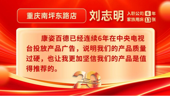 每當劉志明給客戶介紹産(chǎn)品,提到我們是上過央視的品牌,都是滿滿的自豪感。”非常榮幸成爲康姿百德的一名員工,公司良好的品牌形象也給我帶來瞭(le)社會認可度和尊重感,讓我結識瞭(le)很多朋友,收獲瞭(le)許多快樂和感動。今後,我會把康姿百德作爲自己的終身事業,把好産(chǎn)品推薦給更多的人。”