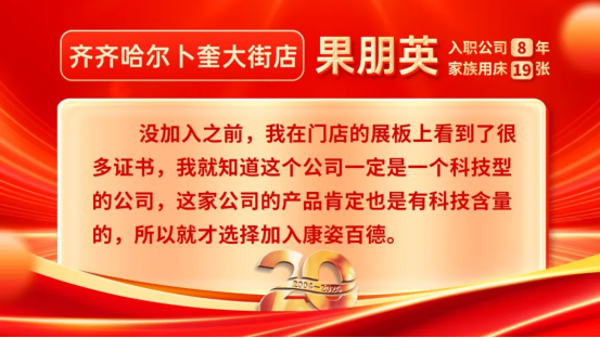 談到爲什麽加入康姿百德,果朋英說道:“沒加入之前,我在門店的展闆上看到瞭(le)很多證書,我就知道這個公司一定是一個科技型的公司,這家公司的産(chǎn)品肯定也是有科技含量的,所以就才選擇加入康姿百德。”