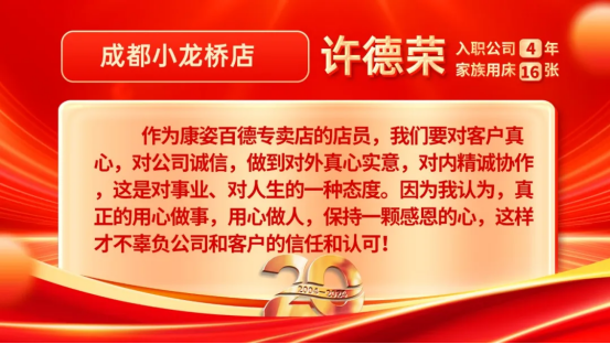康姿百德20周年專賣(mài)店員工的系列故事會(huì)持續推出,讓我們一起期待其他地區專賣(mài)店員工代表的精彩故事吧!