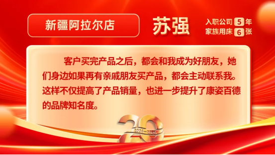 蘇強於(yú)2019年7月加入康姿百德,在門店上班一段時間後,他才知道寝具品牌衆多,但他始終相信康姿百德作爲老品牌,質量和口碑一直都在,是被大家認可的品牌。這也是他堅持要将康姿百德産(chǎn)品推薦給客戶的原因。