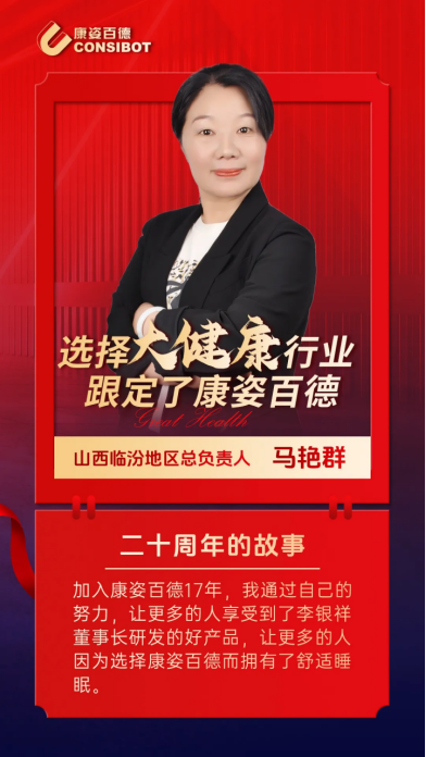 今年是康姿百德集團成立20周年。在20年的發展曆程中,湧現出一大批在經營管理、原料採(cǎi)購、品牌宣傳(chuán)、暖心服務、人才引進和培訓等各個領域立足崗位、奉獻建功的優秀代表。讓我們一起看看這些榜樣故事。本期帶你走進康姿百德山西臨汾地區總負責人馬豔群。