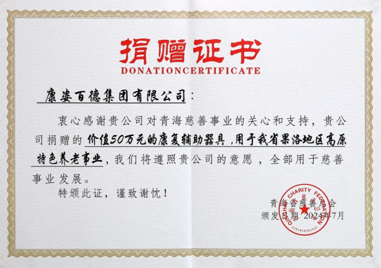 青海省慈善總會爲康姿百德頒(bān)發(fā)“捐贈證書”