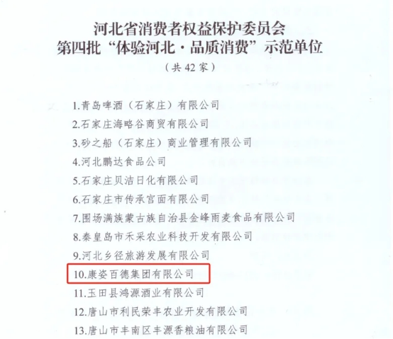 康姿百德集團被評爲河北省“‘體驗河北·品質消費’示範(fàn)單(dān)位”