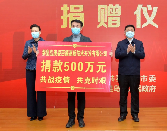 2020年2月1日,康姿百德集團參(cān)加由秦皇島市市委、市政府舉行的“同舟共濟共克時艱堅決打赢疫情防控阻擊戰”捐贈儀式,向社會捐贈瞭(le)500萬元現金和價值近100萬元的口罩、防護服等防疫物資。