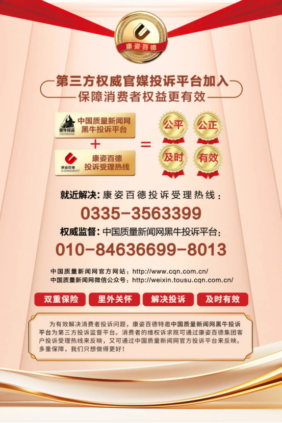 不僅如此,康姿百德還主動(dòng)加入中國消費者協會“智慧315”消費維權投訴平台,特邀“中國質量新聞網黑牛投訴平台”作爲第三方投訴監督平台,多重渠道並(bìng)行,全方位保障消費者的合法權益。