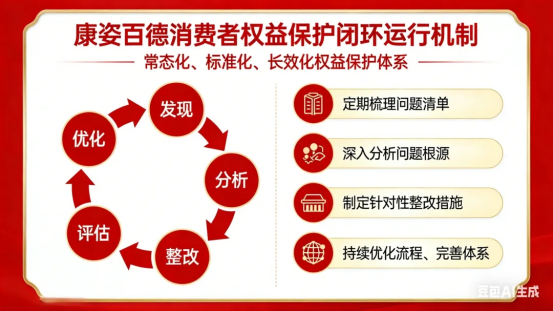爲確(què)保消費者權益保護工作常态化、标準化、長效化,康姿百德構建瞭(le)“發現—分析—整改—評估—優化”的完整閉環運行機制,将權益保護融入企業發展的每一個細節。