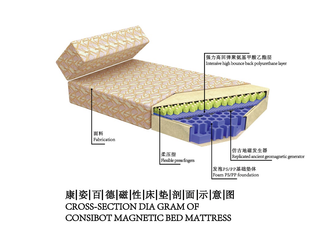 該裝置爲康姿百德磁性床墊内置核心技術之一。 康姿百德科研團隊依據地球磁場自古至今的長期變(biàn)化規律特征,開發出瞭(le)與傳統磁性産品不同的人工模拟弱磁感應地磁空間環境。 它不僅根據古地磁場的一些特征模拟出瞭(le)具有“低磁感應強度、高空間穿透力”特性的弱磁感應磁場【進入人體深層部位的磁感應強度爲1-5 Gs(高斯),墊體上方的空間穿透力爲60cm以上】,而且還在場型結構、磁場梯度、矢量方向等多方面均取得技術突破,彌補瞭(le)因地磁場減弱或鋼鐵屏蔽而對生命體造成的影響。 當人體躺卧在安裝瞭(le)仿古地磁發生器的床體上時,磁力線